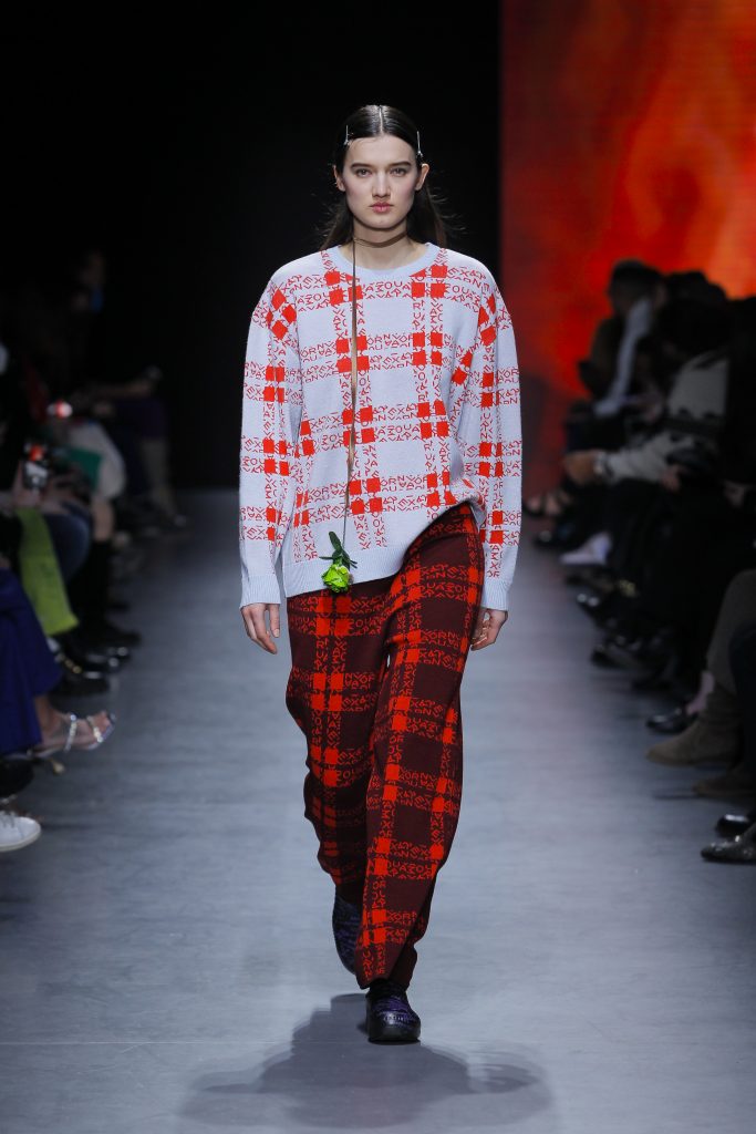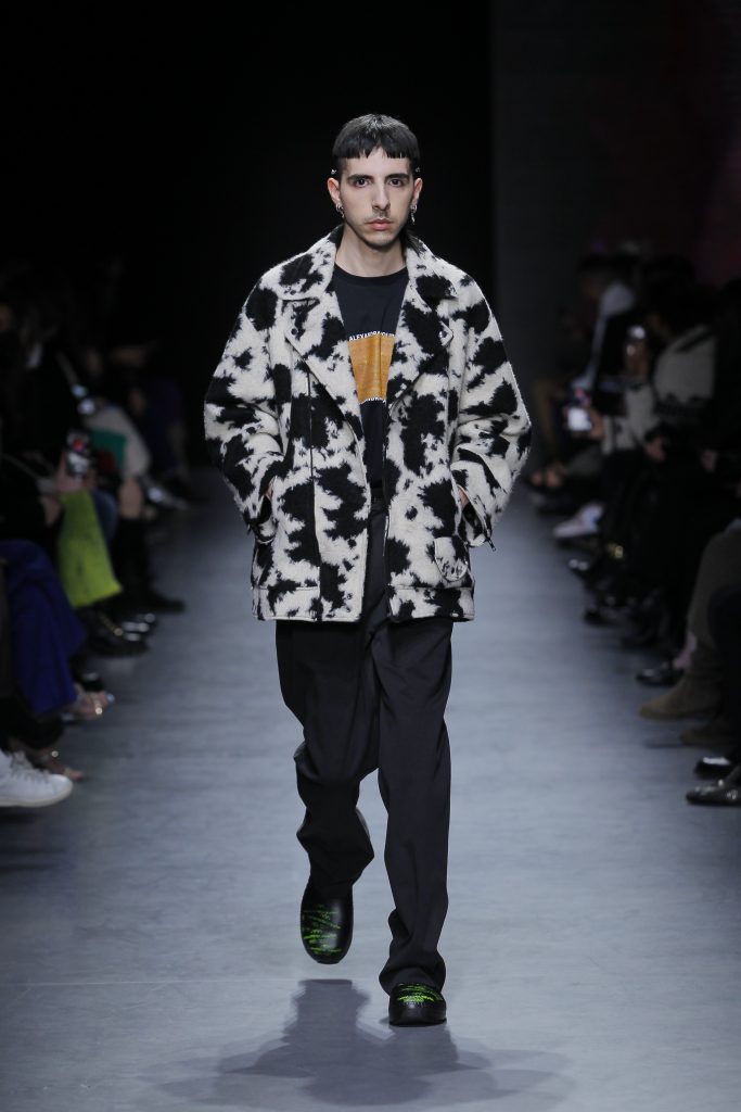 Nel momento in cui ci riaffacciamo sulla piazza pubblica, la domus ci prende per mano. Quella di Moura è fatta di feltro lavorato, di tessuti con motivi cow e maglie tartan, drappeggi in raso, capitonné in ecopelle, di borse che sembrano cuscini. Risaltano le flip-flops e le scarpe stampate per iniezione. Tutto ciò in netto contrasto con l’uso del denim e le silhouette che alludono allo streetwear. Classico/urbano è per Alexandra Moura una dicotomia da mettere in crisi, i cui confini sbiadiscono e giocano a intersecarsi. Una riflessione sull’agio dell’ambiente domestico che viaggia sulle stesse linee del desiderio di condivisione dello spazio pubblico. Il caos nei bottoni disposti in maniera anomala, le bluse di patchwork, le tendine sul top. Errori generativi e destrutturanti che giocano con l’assoluta qualità manifatturiera dei capi, per debordare quel tanto che serve senza volare troppo lontano dal nido.