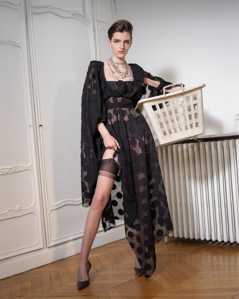 Il lookbook amplifica questa dualità, mettendo in scena un cast di personaggi contemporanei ispirati ai I racconti di Canterbury, immersi in gesti e rituali quotidiani. Un gioco di contrasti tra luce e ombra, dove capi sartoriali dal taglio esasperato in popeline stropicciato si alternano ad abiti eterei in garza a pois o mussola jacquard quasi impalpabile.