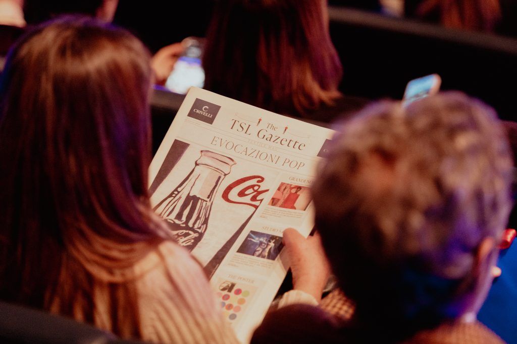 The TSL GAZETTE, ha accolto ospiti e amici del mondo moda, tessile e design insieme con partner che hanno contribuito con la loro presenza e i loro prodotti a valorizzare i concetti di arte, passione, cuore, veri trait-d’union della serata a cominciare da Première Vision Fashion Division che organizza appuntamenti fieristici rivolti ai protagonisti moda e tessile a: Parigi, Milano e nel mondo con lo spirito di inclusività, creatività, informazione e aggiornamento sui trend di stagione che da sempre caratterizzano le sue kermesse, peculiarità riassunte nel video di presentazione proposto agli ospiti prima dell’inizio del film.