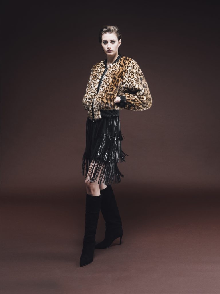L’immaginario si apre con una figura inaspettata: una flapper moderna che indossa un bomber leopardato. Da qui prende forma un racconto fatto di contrasti armonizzati, dove le frange di micro-paillette vibrano leggere sul raso di seta e gli abiti si muovono con una grazia fluida, segnati in vita da cinture dorate. Il riferimento a un’eleganza à la Halston emerge nei lunghi tubini doppiopetto color canna di fucile e nelle silhouette essenziali, ma sempre cariche di presenza scenica.
