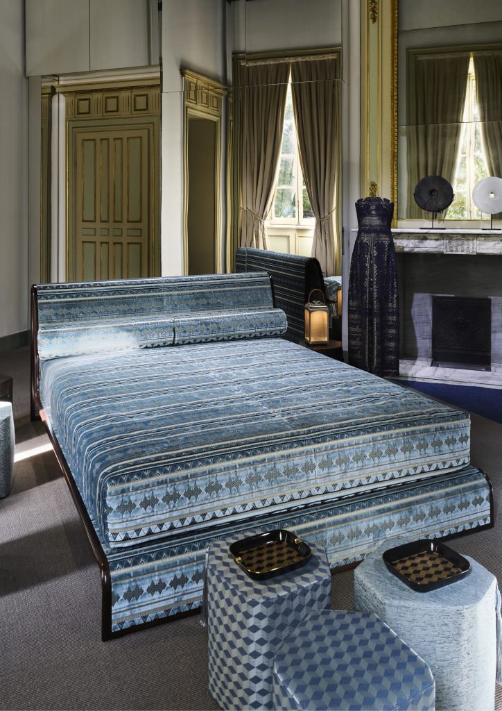 Il viaggio ideale di Echi dal mondo conduce il visitatore attraverso queste terre d’ispirazione. I riferimenti all’Europa si ritrovano nell’essenzialità delle linee e nei giochi di trasparenze e di luce del tavolo TROCADERO, con gambe in plexi e piano con texture onde lacca platino e delle SOFIA, che sembrano scomparire, così come la riedizione del mobile RIESLING, in plexi canneté. Il boudoir, come fosse un piccolo scrigno, accoglie l’abito gioiello, dalla forma scultorea e impreziosito da migliaia di finissime applicazioni. Nel susseguirsi di sale e ambientazioni, passando nella sala degli specchi, dove la Cina è rappresentata dalle delicate sfumature dell’oro, ci colpiscono le atmosfere arabe “mille e una notte” con la riedizione del mobile/contenitore CLUB, con interni di pelle blu, il pouf dalle linee morbide e il paravento, tutti rivestiti nello stesso tessuto canneté con ricamo a tema vegetale. Le statue di pantere di casa Armani ritornano in forma di ricamo sui cuscini decorativi VERVE. Influssi della cultura berbera si ritrovano nel letto MORFEO in noce canaletto, di un design sinuoso e minimale, rivestito di velluto dai motivi geometrici nei toni dell’acquamarina, e nei tavolini ESAGONO, rivestiti in tessuto e resi speciali dall’applicazione di nappine. Il blu intenso dai riflessi cangianti della laccatura del mobile MIRO è ispirato invece agli indumenti dei Tuareg, cui Giorgio Armani ha anche dedicato una storica collezione di abiti.