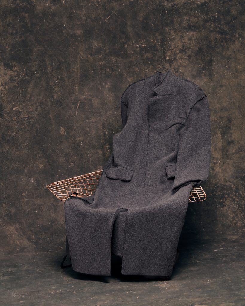 Tra i pezzi più suggestivi: cappotti double cuciti a mano in lana e cashmere, e mantelli pastorali in cashmere, seta o yak con frange naturali; maxi maglioni con effetto spazzolato “nuvola” o con frange in cashmere Donegal, doppio scollo a lupetto o ampio scollo a V; due arazzi artigianali, alti 2,5 metri, realizzati in filati pregiati, trasformando elementi sartoriali in vere opere decorative; pannelli in maglia di cashmere infeltriti, reinventati in cappotti e soprabiti dalla morbida struttura kimono