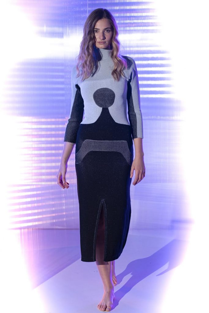 Froy è un progetto di maglieria nato nel 2018 e fondato a Milano da Arman Avetikyan. L’approccio distintivo consiste nel trovare soluzioni originali mixando materiali e filati di alta qualità e lavorando nell’ottica di un’etica sostenibile. Vincitore del Talents Lineapiù, lo stilista è partito dall’evoluzione del primo filato con anima in carbonio, Relax, realizzato da Lineapiù quasi 30 anni fa in collaborazione con l’Università di Ivrea, per sviluppare una serie di capi protettivi. Facendo uno studio approfondito dell’essere umano e della sua anatomia, Froy ha tracciato una mappa che ricalca la struttura del corpo (muscoli, organi, scheletro) semplificandola in un disegno geometrico.