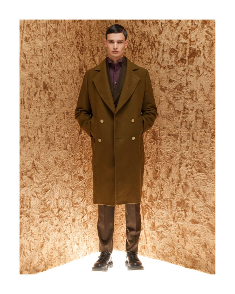 Abiti realizzati in fibre e lane nobili: dal cashmere al baby alpaca, al puro cammello. Tessuti avvolgenti, morbidi e caldi dunque, per un “neo-dandy” che trova piacere nel vestirsi.