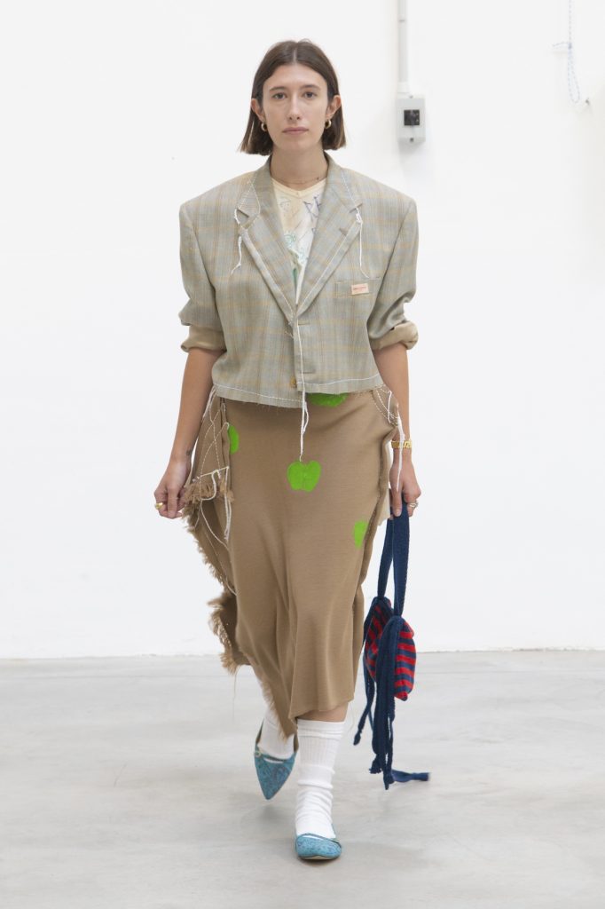 Per comprenderla al meglio bisogna partire da quello che il Direttore Creativo Simone Botte presenta come il concetto centrale della sua collezione: “punkindness” (punk gentile). Un’estetica “cruda”, fatta di cuciture industriali, spille da balia, orli non finiti e graffiti, si mescola con una più delicata e naïve, caratterizzata da ricami, balze, tessuti con scritte simili ai quaderni dei bambini, stampe fatte a mano utilizzando una mela come timbro. I materiali sono rigorosamente riciclati e provenienti dagli scarti e i modelli sono scelti tra amici e fan del brand, che completano lo styling con accessori che sono abituati a portare ogni giorno, definendo la loro vera identità.