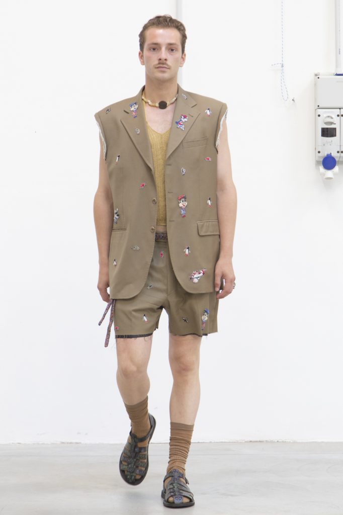 In particolare i materiali provengono da lenzuola di vecchi corredi in lino e cotone; camicie upcycled nelle classiche trame maschili; pezzi di paracadute; maglieria realizzata con i fine rotoli di filati di lana, cotone e seta; capi in jersey riciclato decorati con una cucitrice industriale; ricami naÏf con i messaggi della collezione; sartoria distrutta e ricomposta.