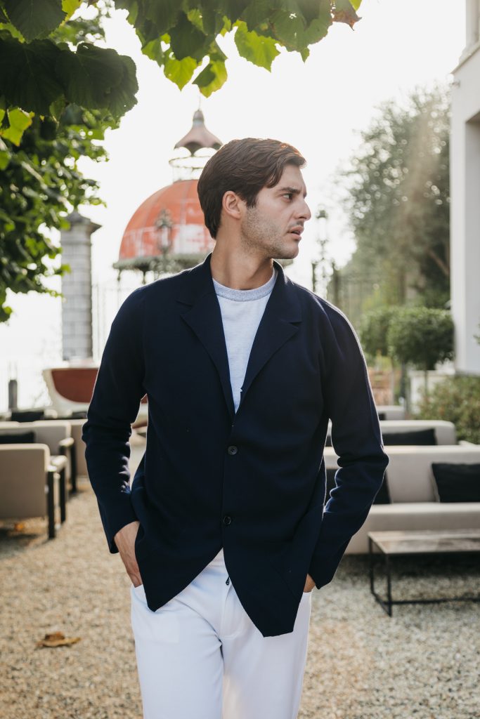 Traspirante e con proprietà di termoregolazione, il filato Carbon/Cotton è naturale al 100% e ha uno speciale effetto antistress in quanto funge da schermo protettivo contro l’assorbimento di energia statica e l’elettrosmog. Leggermente rimborsata, la maglia a maniche corte ha profili grigio mélange, sporty-chic. La giacca-cardigan maschile da indossare sopra, ha una vestibilità così perfettamente calibrata da poter essere indossata anche al femminile, con elegante nonchalance. È destrutturata, ha tasche applicate in cui affondere le mani in stile flaneur ed è in maglia di cotone makò, dotata di una mana e una lucentezza straordinarie. Anche questi tanto semplici quanto raffinatissimi passepartout nascondono un ulteriore segreto che accomuna tutte le creazioni SVEVO: in fase di tessitura vengono operati piccolissimi fori sul retro di ogni maglia, un marchio di fabbrica, il dettaglio più sussurrato e, pertanto, più aristocratico, che si possa indossare. Per stare bene.