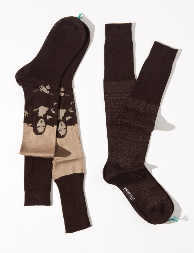 L’arte e la poesia sono state di volta in volta protagoniste di alcune nostre calze: ad esempio alcuni anni fa le abbiamo decorate con i versi della Divina Commedia, quest’anno di grande attualità alla luce dell’anniversario dantesco, oppure con i versi dell’Amleto o con i dettagli della Cappella Sistina o l’effigie della Gioconda. Sono temi molto apprezzati all’estero, dove vendiamo il 90% della nostra produzione, fra Usa, Europa e Giappone.