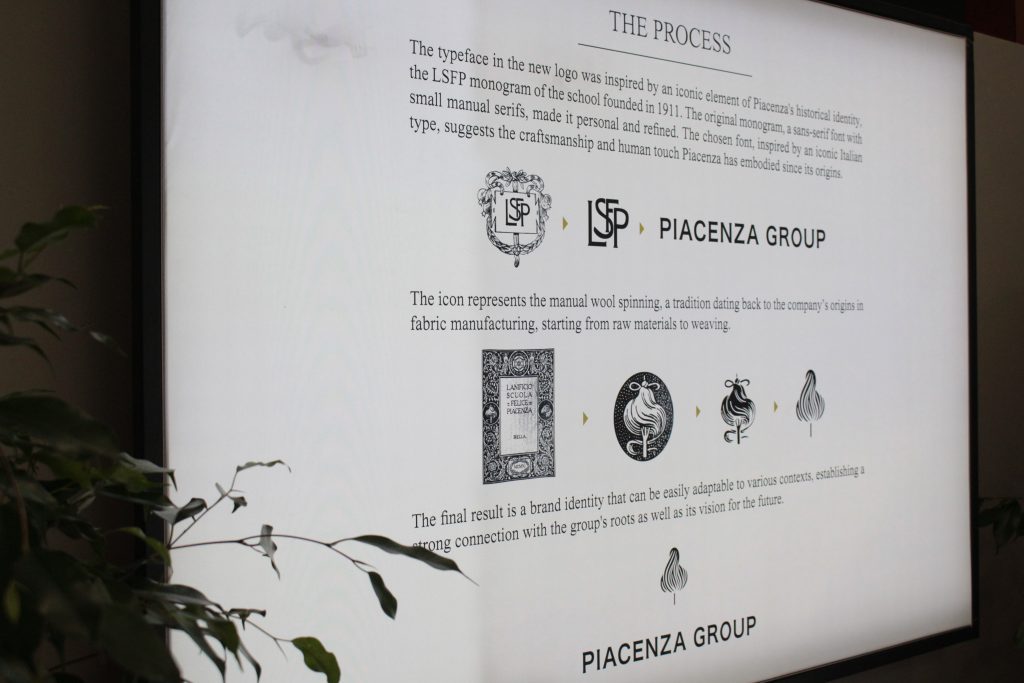 “Abbiamo voluto rendere omaggio alle origini della nostra storia, alla materia prima, elemento fondamentale delle nostre realtà. Dopo un’approfondita ricerca negli archivi e documenti di famiglia, abbiamo trovato delle antiche fotografie del Lanificio Scuola Felice Piacenza, fondato nel 1911 per formare le maestranze locali. Siamo rimasti affascinati dai molteplici simboli dell’industria laniera raffigurati sulla facciata della scuola, tra cui una spola di lana e il monogramma del Lanificio Scuola. Entrambi i simboli sono stati rinnovati grazie a un restyling che stilizzasse le forme e si ispirasse al carattere tipografico di un noto tipografo piemontese. Riteniamo possa essere un trademark capace di adattarsi a nuovi contesti, portavoce di un forte legame con le radici del gruppo,” afferma Vasiliy Piacenza, Co-Amministratore Delegato.