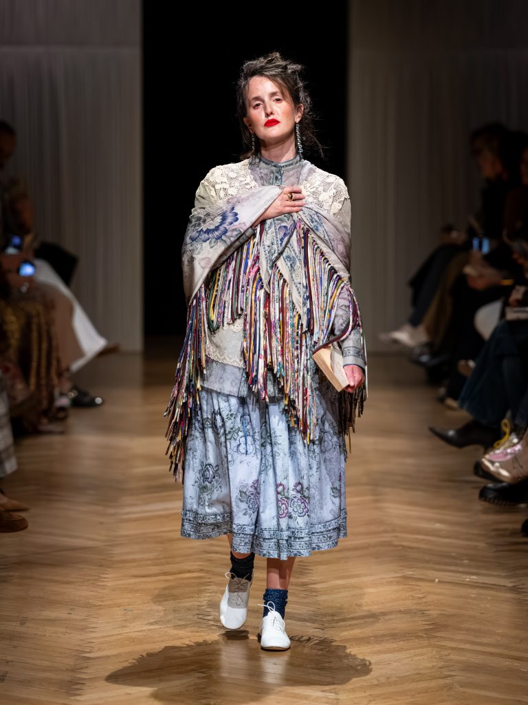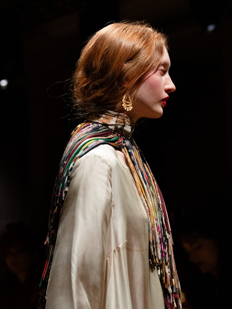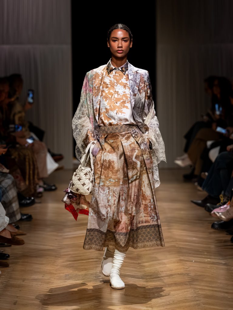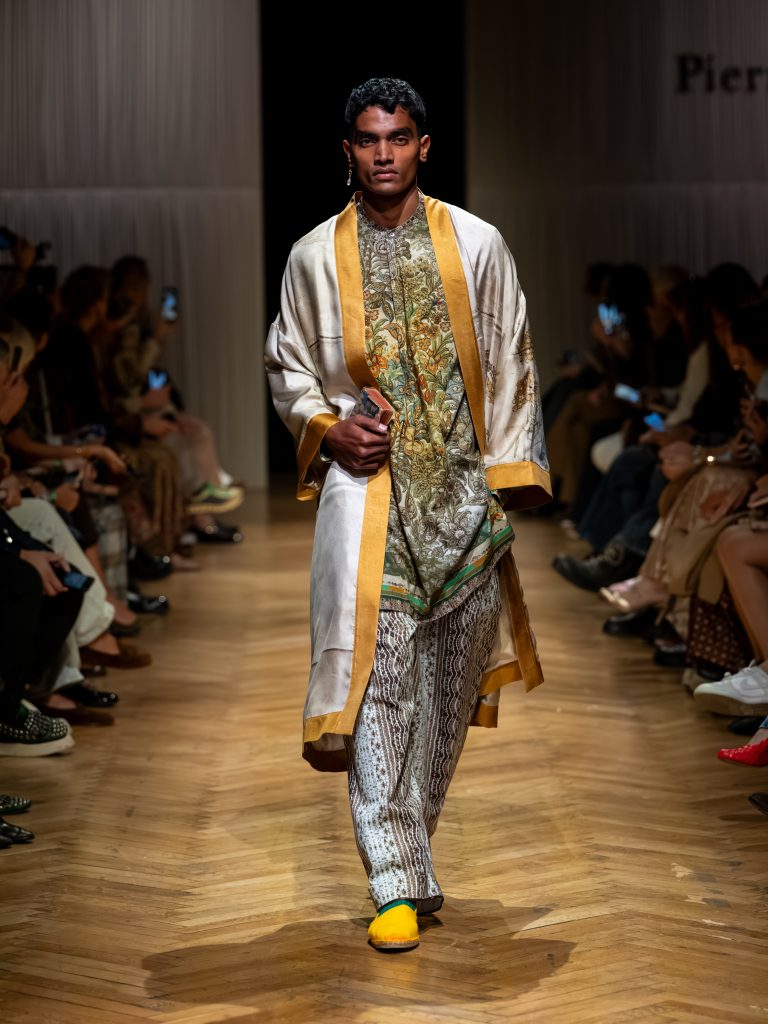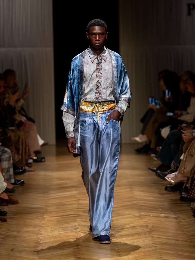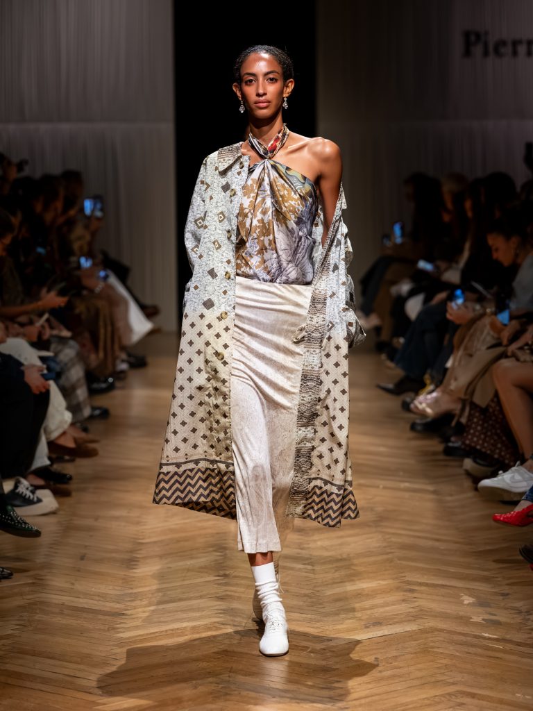 La seta è la grande protagonista della collezione, declinata attraverso 18 stampe originali che mettono ancora una volta in risalto la maestria di Pierre-Louis Mascia nell’arte di mescolare motivi diversi, un’interpretazione personale di colori e giustapposizioni. Accanto alla seta, il jersey avvolge il corpo con naturalezza, mentre gonne ampie e ariose, impreziosite da delicate balze, donano movimento e femminilità. La proposta si completa con bomber e trench ultraleggeri, pensati per le giornate più fresche. Jeans con sorprendenti effetti trompe-l’œil aggiungono un tocco creativo e inaspettato, evocando lo spirito del palcoscenico.Un equilibrio tra eleganza rilassata e sofisticata nonchalance che è la cifra stilistica di Pierre-Louis Mascia.