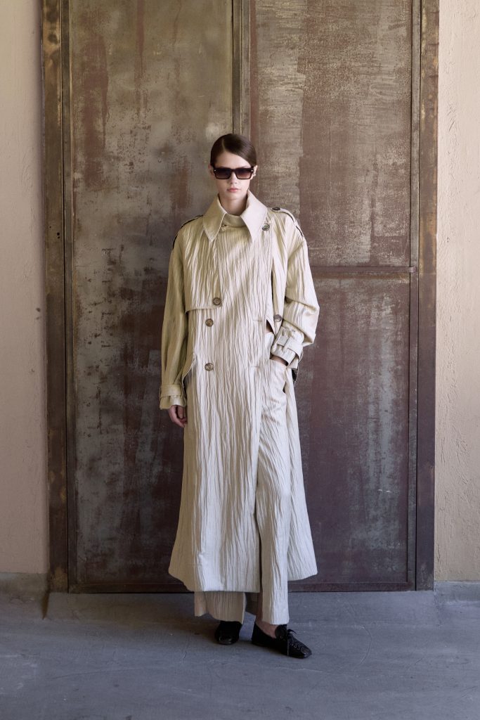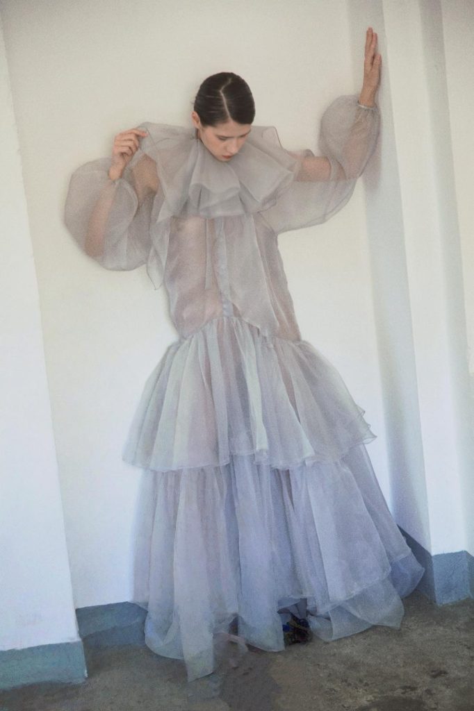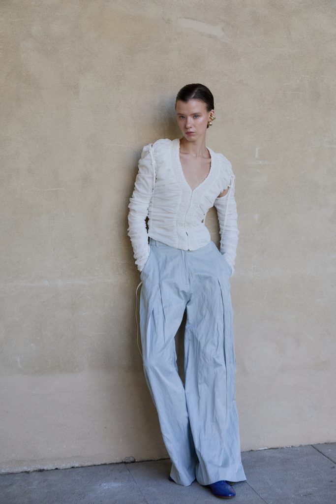 I tessuti parlano la lingua del silenzio e della memoria: reed lace, voile in seta, canvas di juta, gauze, metal duchesse, fil coupé. Ogni superficie è una traccia, un sussurro, un messaggio segreto tra corpo e abito. Tra le proposte più iconiche della collezione: Dress Cloud Busting in voile di seta polvere, etereo e leggerissimo, avvolge il corpo come un pensiero in dissolvenza; Dress Willow in reed lace nera o avorio, ha una costruzione rituale che unisce forza e sacralità, con corpino a nido d’ape come seconda pelle; Dress Violante fluttuante, stratificato, disponibile anche in versione mini; con o senza crinoline, incarna il mistero della rinascita; Dress Electra una maxi-gonna in equilibrio tra architettura e onde, nei toni butter, coral cream, sky e yellow white; Dress Rosanthe: tagliato in sbieco, in voile arricciato, sospeso tra il non detto e il desiderato; Skirt Dress Memole abito-scultura in organza e gauze, definisce un confine tra sogno e struttura; Jacket Sofia Coppola: in canvas bianco e fil coupé, rende omaggio alla musa del cinema con eleganza androgina; Tailleur Crossedreinterpretazione fluida del potere femminile, in tonalità butter, black, coral cream; Shirt Bryan: camicie come pagine bianche in chiffon e cotone svizzero, da scrivere ogni giorno; Jacket Sahara: si scompone in due, in reed lace o stretch cotton, diventando gilet e micro top.