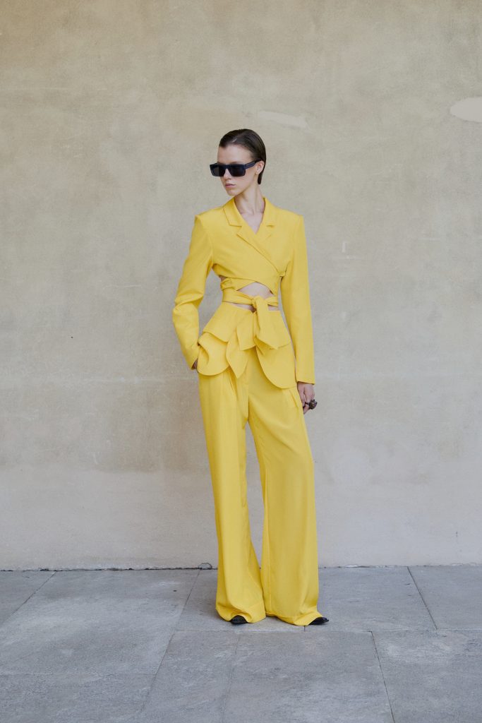 “Severance” prende forma da un’idea precisa: quella di una separazione interiore che si manifesta e si trasforma, attraverso l’abito, in una nuova bellezza. I capi evocano legami interrotti, tensioni non risolte, ma ancora presenti nella materia. I drappeggi si annodano in sete liquide, le organze si aprono in plissé irregolari, come memorie che vibrano sulla pelle. Le superfici ricamate in foglie di corda diventano mappe del corpo, mentre le strutture sartoriali svelano una precisione emozionale: crinoline nascoste, orli rimessi, volumi che sembrano “autoindossarsi”, come mossi da una vita propria. La palette cromatica è un paesaggio dell’anima, fatto di toni sussurrati come butter, dusty, coral cream, sky e ivory, alternati a accenni più vitali di red, yellow white e black. I colori non impongono, ma accompagnano, in un equilibrio raffinato di trasparenze e contrasti delicati.