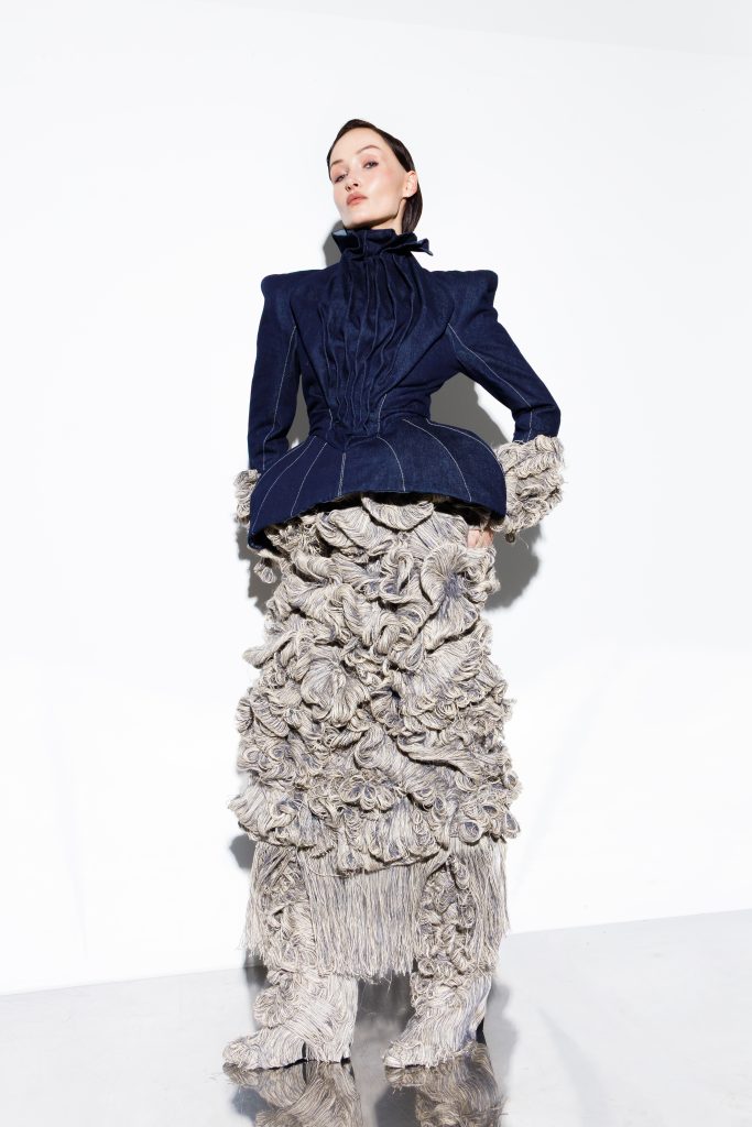 L’esposizione presenta 8 look che reinterpretano il denim con tessuti a basso impatto o rigenerabili, combinati a tecnologie di tintura e finitura capaci di ridurre drasticamente acqua e sostanze chimiche. I materiali provengono da PureDenim Srl, mentre lavaggi e trattamenti sono firmati da Tonello Srl, leader nelle tecnologie per finiture sostenibili. Gli 8 designer protagonisti – Institution (Georgia-Italia), Gerrit Jacob (Germania), Jeanne Friot (Francia), Macy Grimshaw (Regno Unito), Nadya Dzyak (Ucraina), Sia Arnika (Danimarca), Gisele Ntsama (Camerun-Italia) e Phan Dang Hoang (Vietnam) – reinterpretano il denim in chiave creativa, sperimentale e sostenibile.