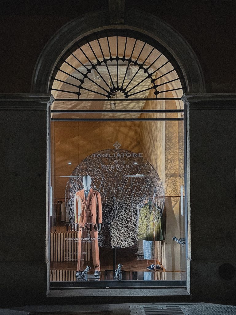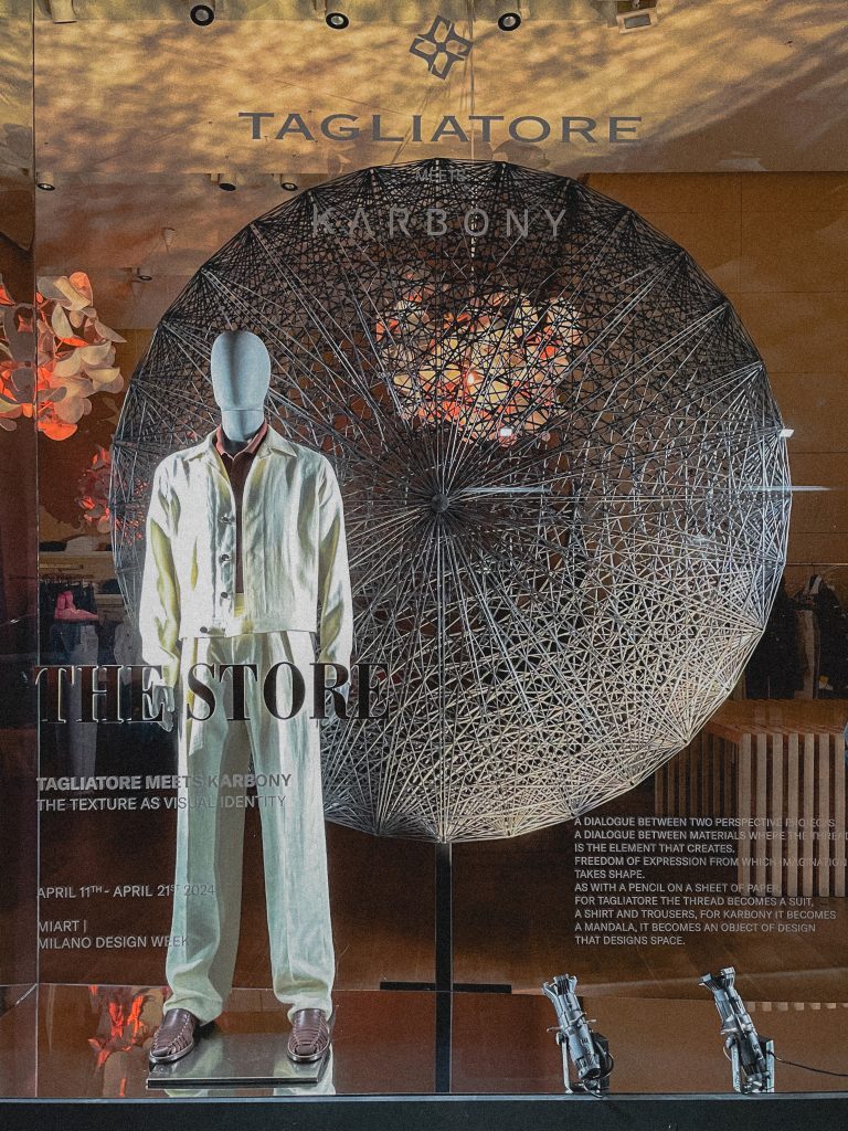 L’iconica Boutique The Store, situata nel cuore di Brera in via Solferino 7, si è trasformata in un palcoscenico dove l’installazione “Tagliatore incontra Karbony: la trama come identità visiva” ha preso vita. Questo incontro tra due realtà italiane non solo condivide una vocazione sartoriale, ma anche un pensiero creativo incentrato sulla produzione di prodotti per lo stile di vita contemporaneo. L’installazione rappresenta un dialogo visivo tra i capi della collezione uomo di Tagliatore e i complementi d’arredo Mandala di Karbony. Davanti alle vetrine di The Store, tessuti performanti e tecnici si sono mescolati armoniosamente con freschi lini e morbide gabardine, creando un incontro tra tradizione e modernià. Allo stesso tempo, i complementi d’arredo Mandala di Karbony, con le loro forme circolari, schermano e filtrano la luce, creando un gioco di ombre decorative che amplificano l’atmosfera dell’ambiente.