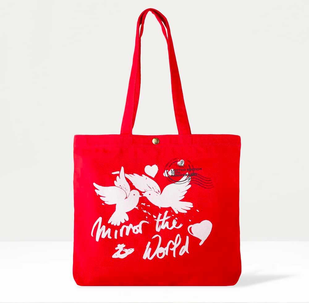 Per celebrare questa pietra miliare, gli artigiani hanno realizzato una piccola capsule collection in edizione limitata. Una borsa e un cappellino in cotone rosso organico 100% africano su cui gli artigiani in Kenya hanno stampato a mano in bianco il manifesto culturale di Dame Westwood e la grafica Mirror the World disegnata dalla stessa stilista.